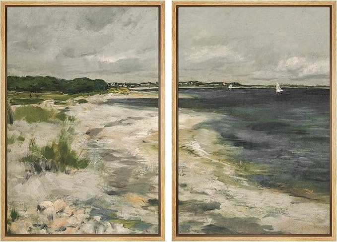 MUDECOR Framed Canvas Print Wall Art Coastal Shoreline with Lush Dunes Serene Beach Landscape Nature Wilderness Illustrations Realism Decorative for Living Room, Bedroom, Office - 24"x36"x2 Natural