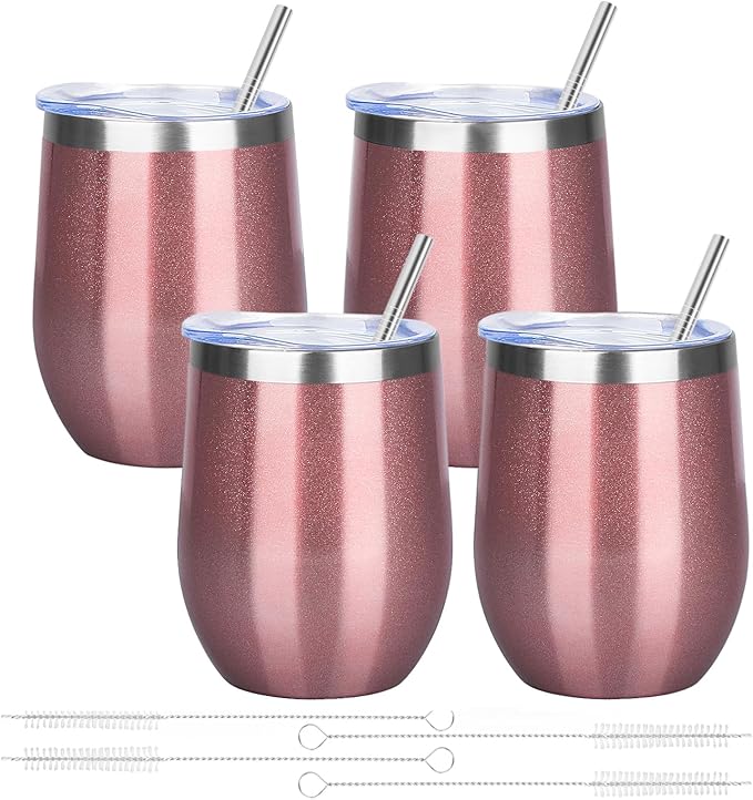12oz/4 Pack Wine Tumbler Glasses with Lid Stemless Double Wall Vacuum Stainless Steel Travel Tumbler Keeping Cold & Hot for Wine,Coffee,Cocktails,Drinks-Family and Gifts(Rose gold)
