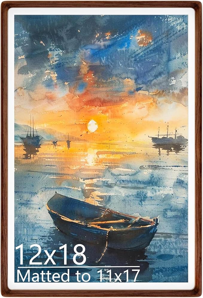12x18 Picture Frame in Natural Walnut Wood, Solid Wooden Photo Frames Matted to 11x17, Gallery Poster Frames for Wall Mount Sale