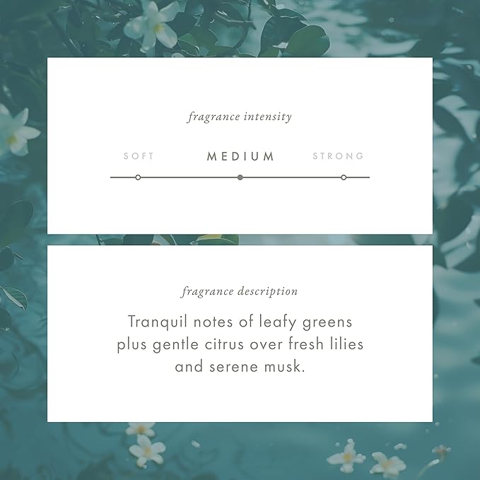 TRANQUILITY LIES IN THE STILLNESS OF A LILY POND, WHERE THE ONLY MOVEMENT COMES FROM THE RIPPLE OF A PASSING DRAGONFLY. Pause on the charming footbridge for a peaceful moment of reflection. Breathe in the fragrant notes of fresh lily, leafy greens, and gentle citrus as the surrounding trees kindly lend their earthy, woodsy musk.