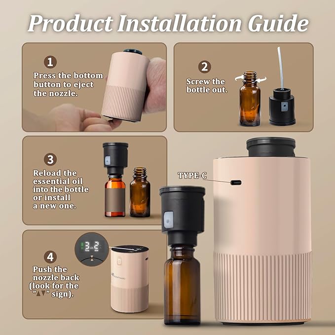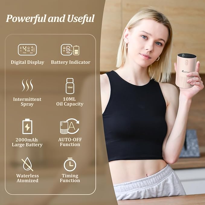 Waterless Diffuser for Essential Oil - Aroma Diffuser for Home with Battery Indicator, Portable Smart Scent Air Machine 1/2/3 & Continuous Mist, Timing & Auto-Off Function (Pink)