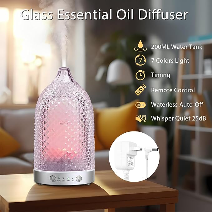7 Colors Glass Diffuser, 200ML Essential Oil Diffuser, Ultrasonic Aromatherapy Diffuser with Timer, Auto-Off Protection, Cool Mist Aroma Diffuser for Home, Office,Yoga (Silver)