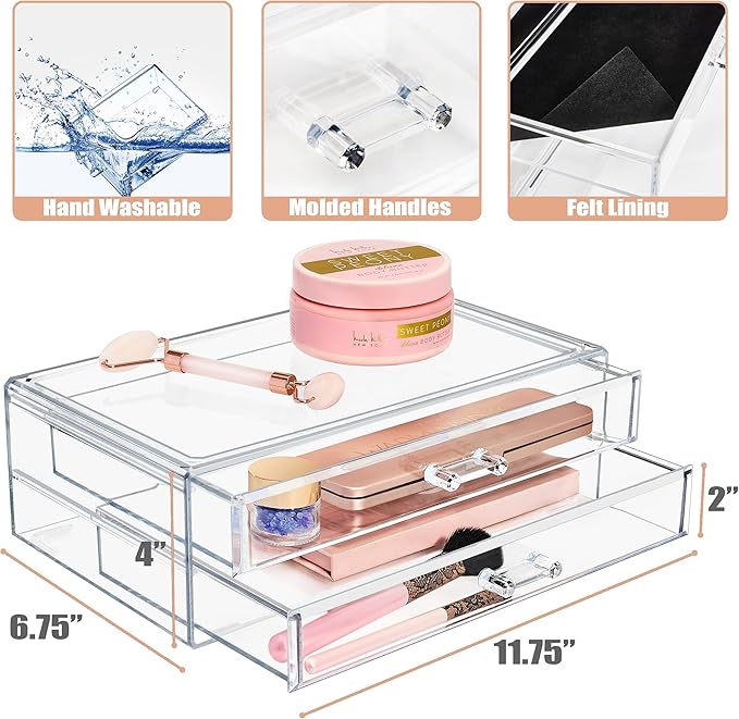Sorbus Stackable Acrylic Drawers - 2 Clear Storage Drawers for Organizing Make up Palettes, Nail Polish, Hair Accessories, Cosmetics & Beauty Supplies - Makeup Organizer for Vanity, Bathroom Organizer