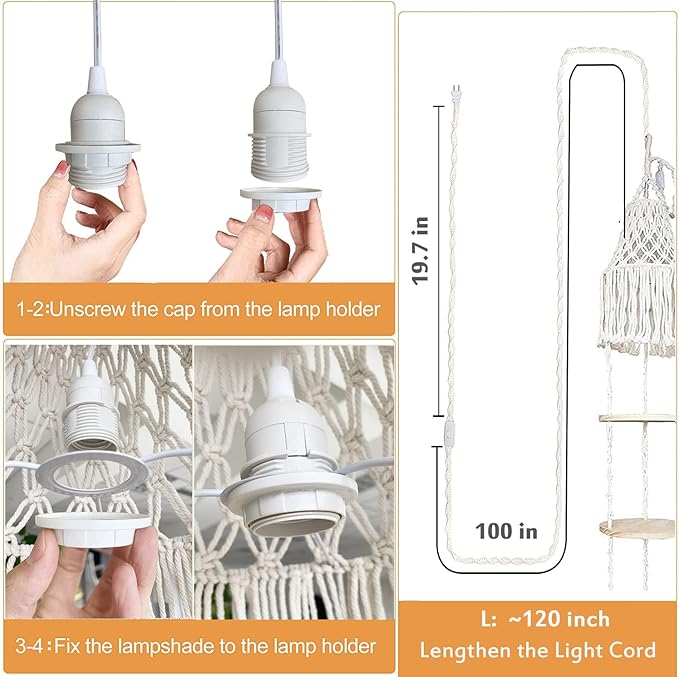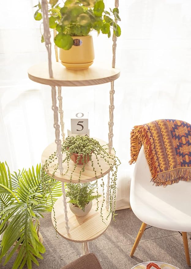 Macrame Plant Hanger Shelf Hanging Rope Shelf Indoor with Boho Lamp Shade 3 Tier Floating Round Shelves Decorative Shelf Flower Pot Holder Planter Display Rack Boho Home Decor-1 Set