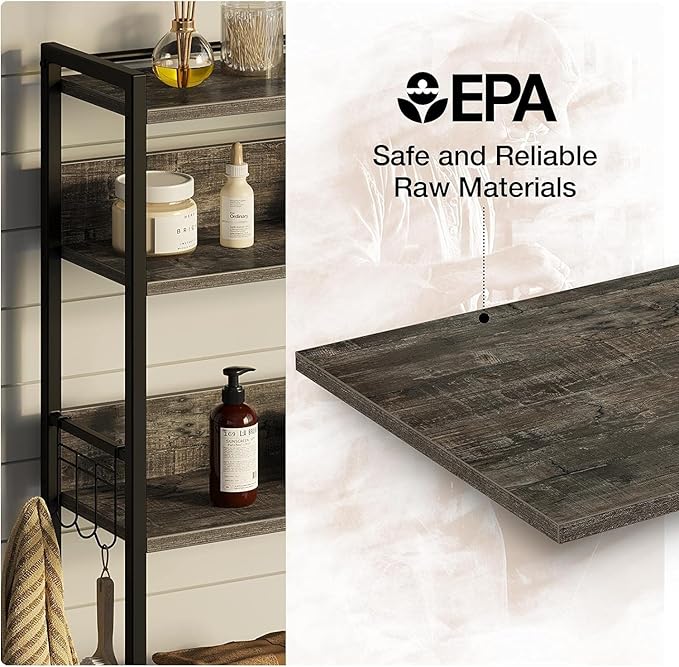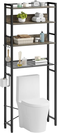 Rolanstar Over The Toilet Storage 4-Tier, Freestanding Bathroom Organizer, Sturdy Behind Toilet Rack with Hooks, Space-Saving Design, Fits Most Toilets, Gray