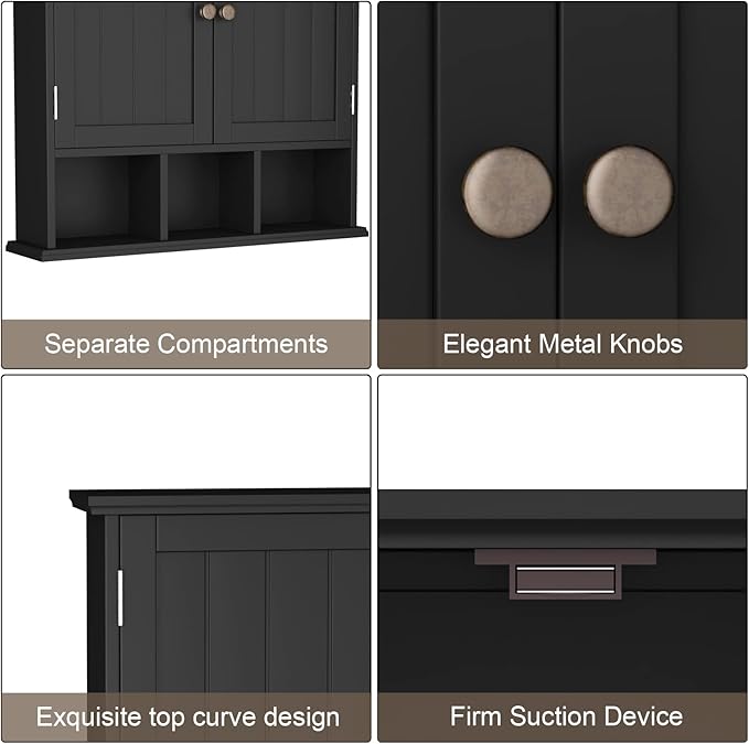 ChooChoo Bathroom Cabinet Wall Mounted 2-Door with 3 Open Shelves, Wooden Medicine Cabinets with Adjustable Shelf,Space Saver Storage Cabinets Over The Toilet for Bathroom&Living Room,Black