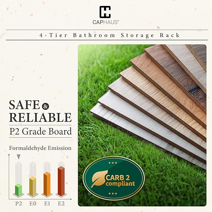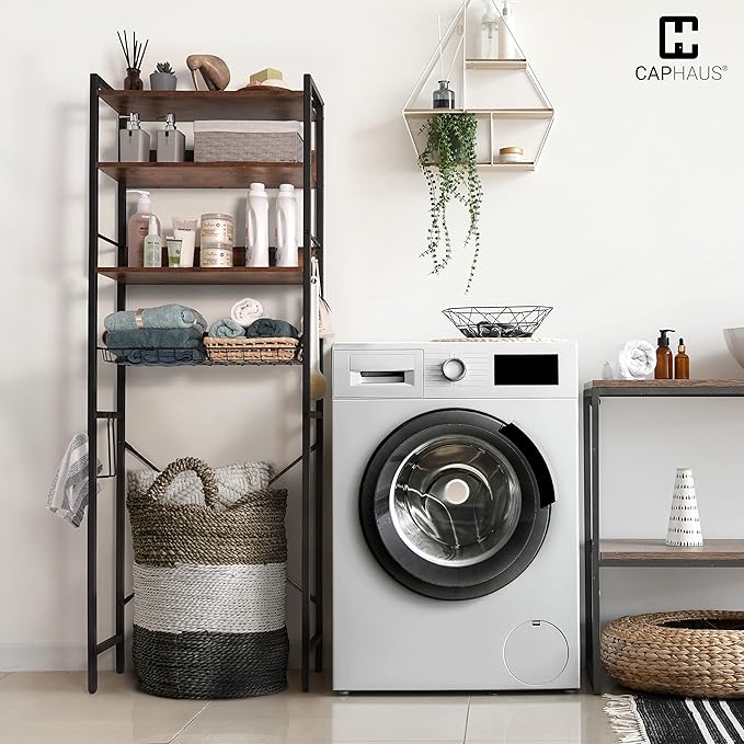 CAPHAUS Over The Toilet Storage, 4-Tier Bathroom Organizer, Freestanding Toilet Shelf, Multifunctional Space Saver Toilet Rack with 4 Hooks, Laundry Organizer, Plant Stand for Balcony (Rustic Oak)