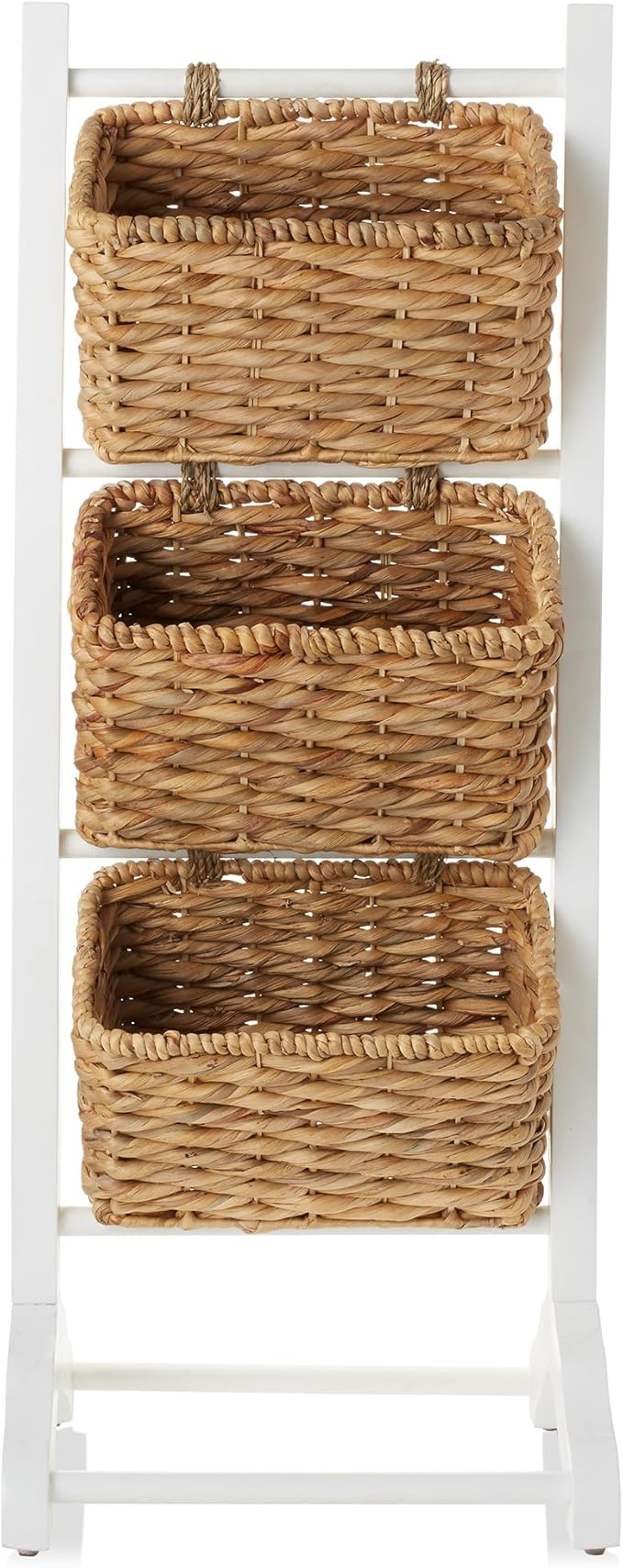 Casafield 3-Tier Floor Stand with Water Hyacinth Storage Baskets, White/Natural - Standing Organizer Rack for Bathroom, Kitchen, Laundry, Living Room