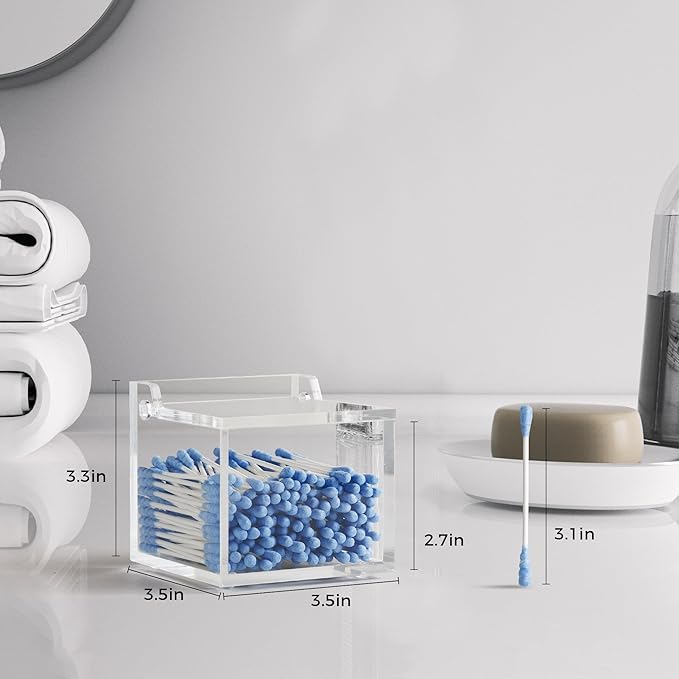 Clear Acrylic Qtip Holder With Lid Cotton Balls Swab Organizer,Square Q Tip Storage, Floss Picks, Bath Salts, Cotton Wab Holder,Home Bathroom Decor (DP011)