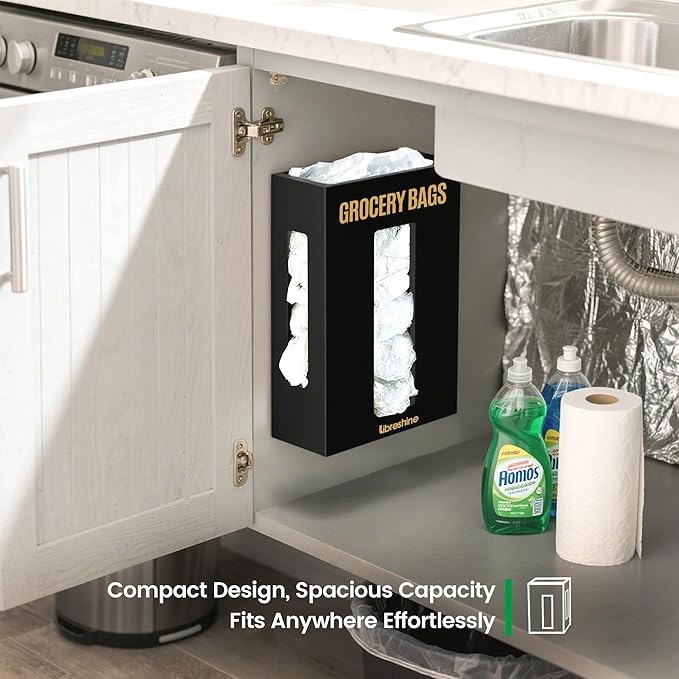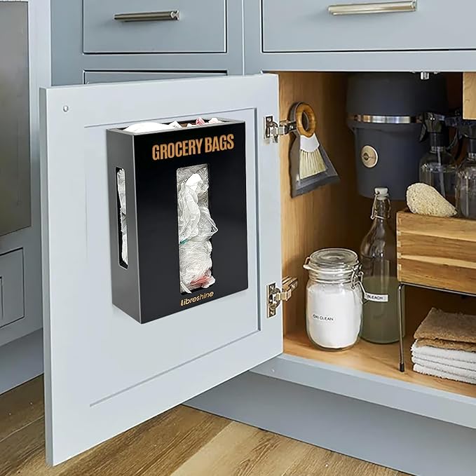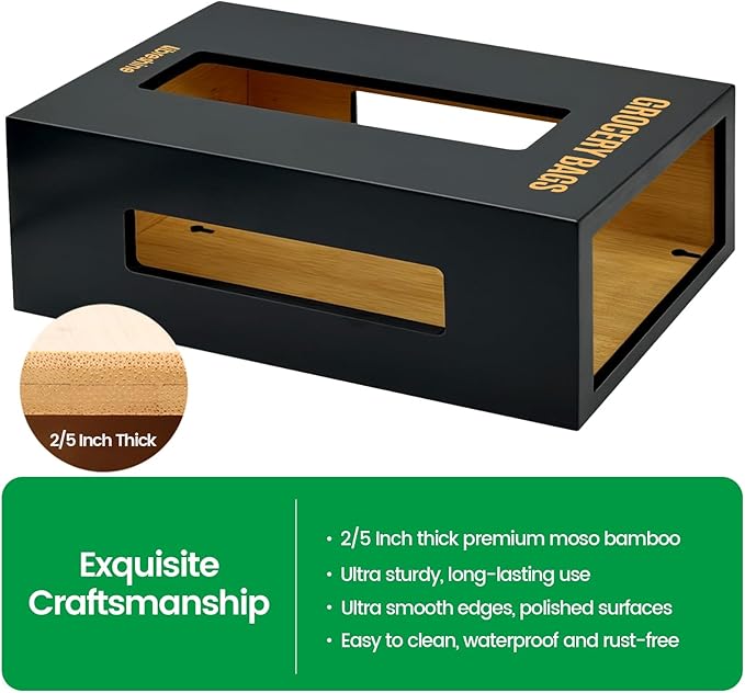 Extra Large Bamboo Plastic Bag Holder Black- Under Sink, Cabinet & Wall Mount Storage - Multipurpose Gorcery Bag Organizer with Space-Saving Design for Kitchen, Pantry, Bathroom, Garage