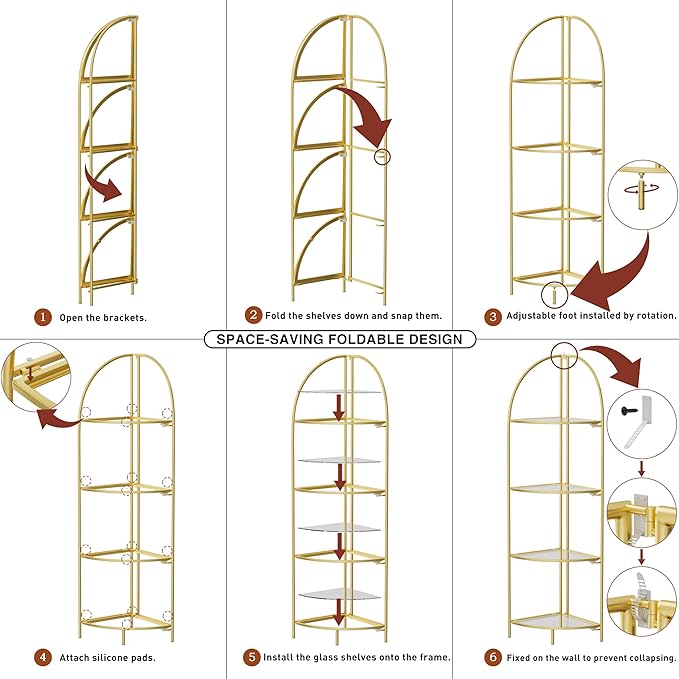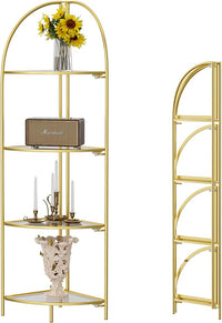 Crofy Foldable 4 Tier Corner Shelf, Metal Corner Plant Stand with Gold Frame and Transparent Shelves, Corner Display Rack Multipurpose Shelving Unit for Living Room, Bedroom, Bathroom