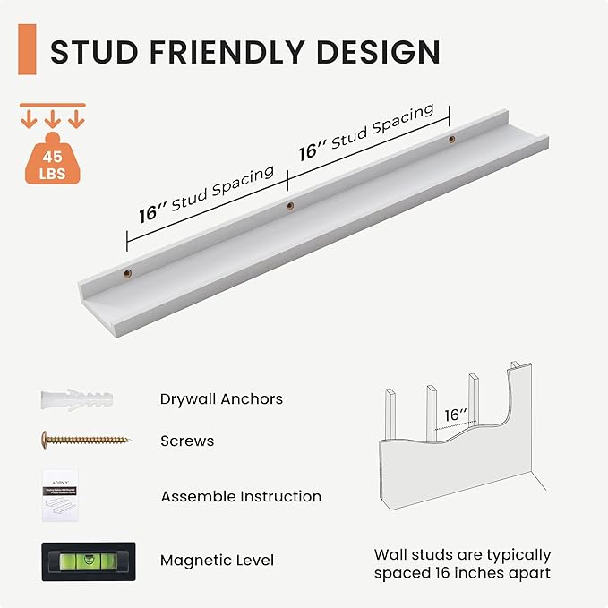 Solid Ash Wood Picture Ledge Shelf, 36 Inch Floating Shelves with Lip Set of 2, Photo Ledge Shelf Nursery Bookshelf Wall Mounted for Living Room Bedroom Decor, White
