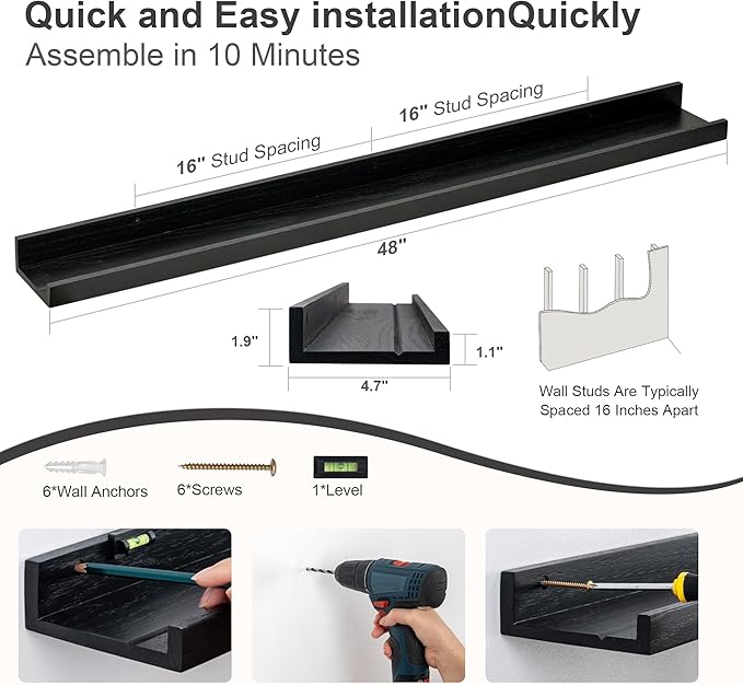 Floating Picture Ledge Shelves 48 Inch Solid Oak Wood Set of 2, Rustic Wall Storage Shelves with Lip, Kids Bookshelf, Photo & Picture Ledge Shelves for Bedroom, Living Room, Kitchen