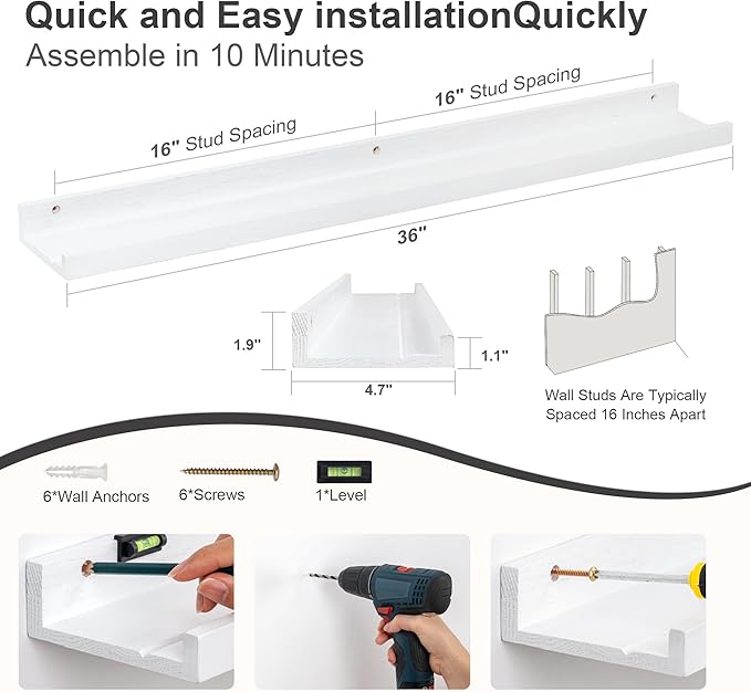 Floating Picture Ledge Shelves 36 Inch Solid Oak Wood Set of 2, Rustic Wall Storage Shelves with Lip, Kids Bookshelf, Photo & Picture Ledge Shelves for Bedroom, Living Room, Kitchen