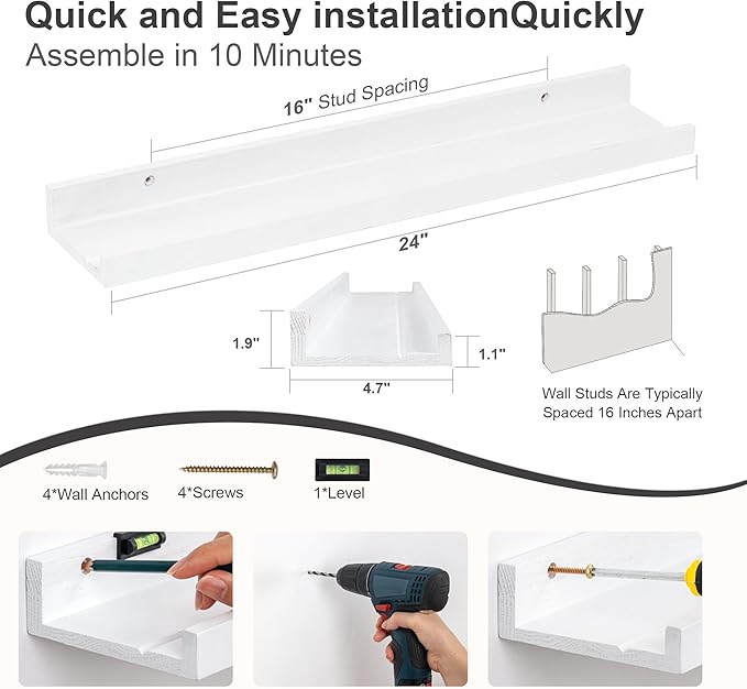 Floating Picture Ledge Shelves 24 Inch Solid Oak Wood Set of 2, Rustic Wall Storage Shelves with Lip, Kids Bookshelf, Photo & Picture Ledge Shelves for Bedroom, Living Room, Kitchen