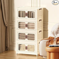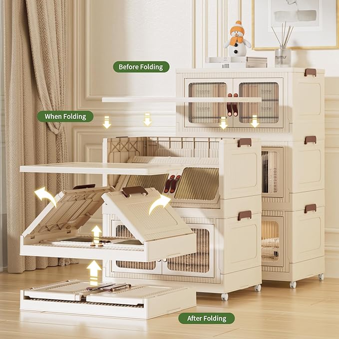Stackable Storage Bins, Folding Storage Bins with Lids and Doors, Open Front Folding Storage Box with Wheels Plastic Storage Containers (4 Tier (Side Windows Not Visible), 55 Qt)