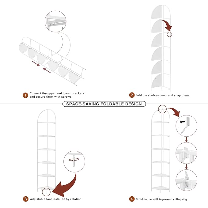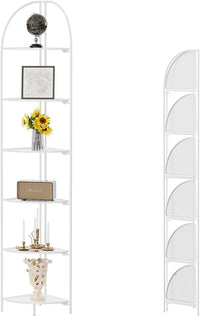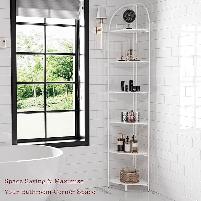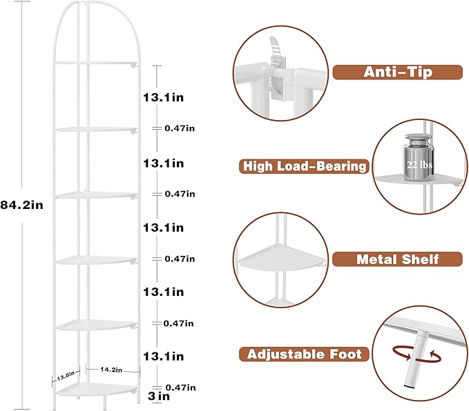 Crofy Foldable 6 Tier Corner Shelf, Metal Corner Plant Stand with White Frame and White Shelves, Corner Display Rack Multipurpose Shelving Unit for Living Room, Bedroom, Bathroom