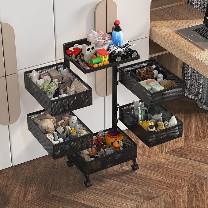 Rolling Rotating Storage Cart No Assembly Required,Bathroom Shelf Fruit and Vegetable Basket for Kitchen,Storage Drawer Organizer Cart ,Metal Utility cart on Wheels(Black, 5 Tier-Square)