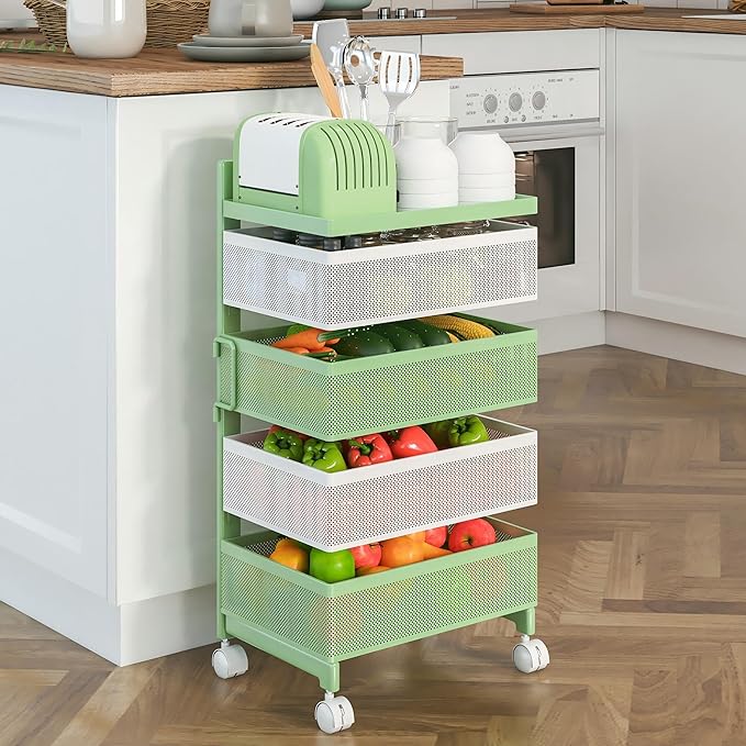 Fruit Basket for Kitchen No Assembly 4-Tier Rotating Storage Rack, Vegetable Storage Cart,Bathroom Shelf,Storage Drawer Cart,Kitchen Organizers and Storage Cart(Green White, 4 Tier-Square)