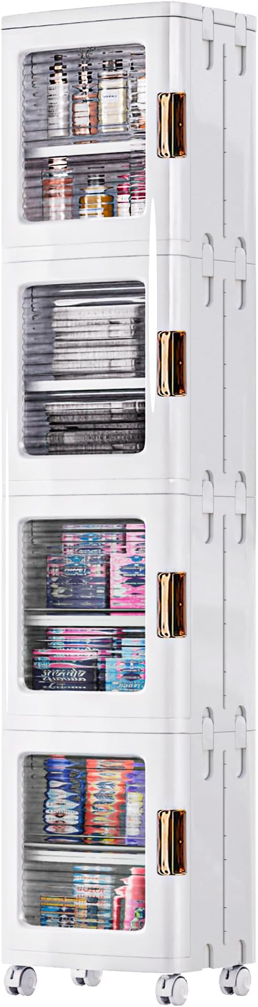VECELO 4-Tier Plastic Tall Narrow Storage Cabinet with Movable Wheels, Adjustable Shelves, Magnetic Doors, Slim Bathroom Organizers and Storage for Small Space, Bathroom, Kitchen, Laundry, White