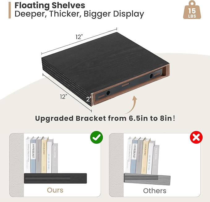 Heimlove 12 Inch Deep Floating Shelves, 12 x 12 inches Long Wall Shelf, Large Extra Display Shelf & Storage Shelf, Rustic Wood Wall Shelves for Fireplace Mantel, Black - 2Pack