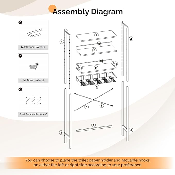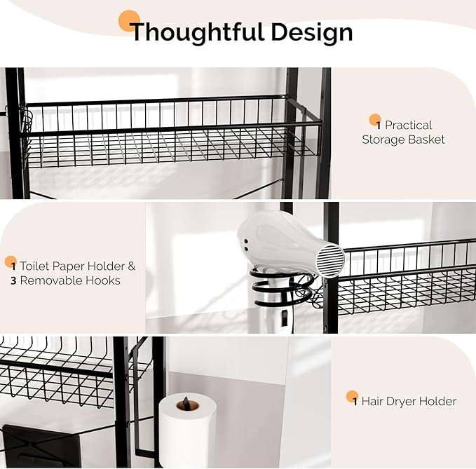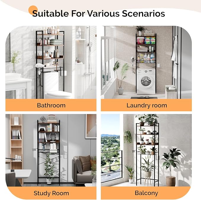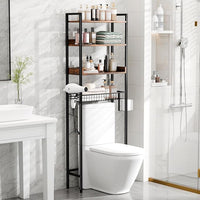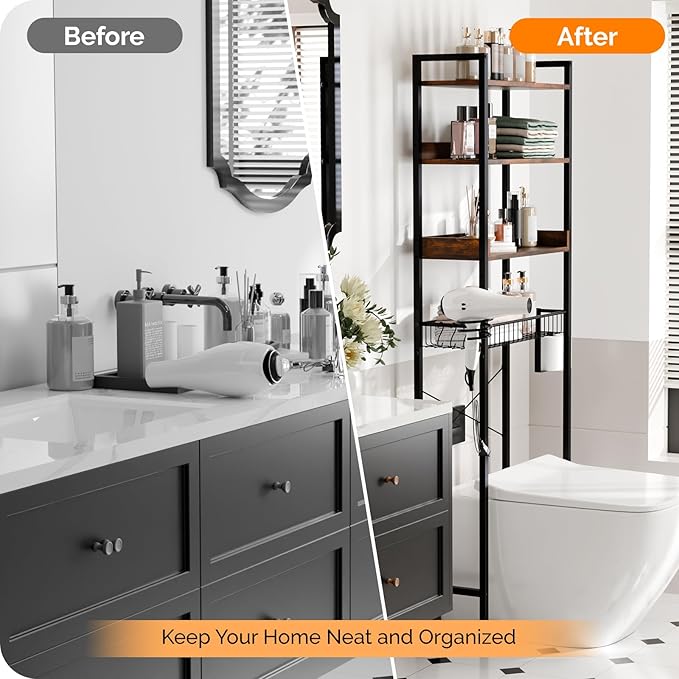 VINGLI Over-The-Toilet Storage Cabinet | 4-Tier Adjustable Shelves with Basket & Hairdryer Holder | Freestanding Bathroom Organizer Above Toilet, Durable Space-Saving Rack with Hooks (Rustic Brown)