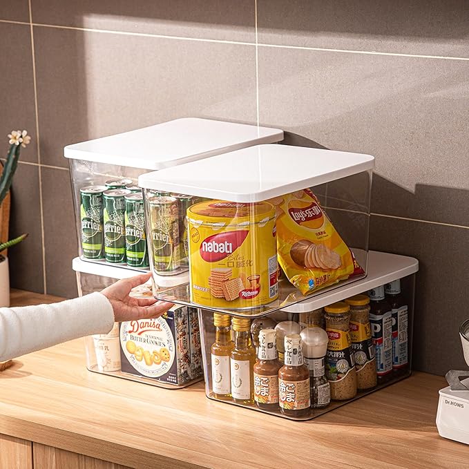 Clear plastic storage bins with LIDS-4packs,storage containers for snacks, cosmetics, books, dog food, Storage Organizer for Nursery,Kitchen, Living room,Bedroom, Bathroom, Office (Clear-White Lid)