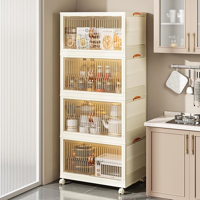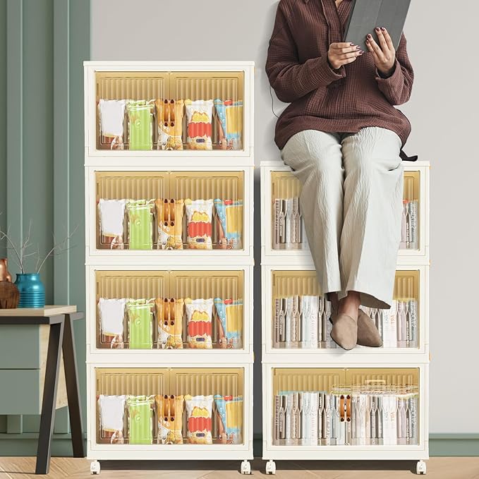 Stackable Storage Bins 104 Qt, Folding Storage Box with Lids and Doors, Open Front Folding Storage Bins with Wheels Large Plastic Storage Container Closet Organizers (4 Tier)