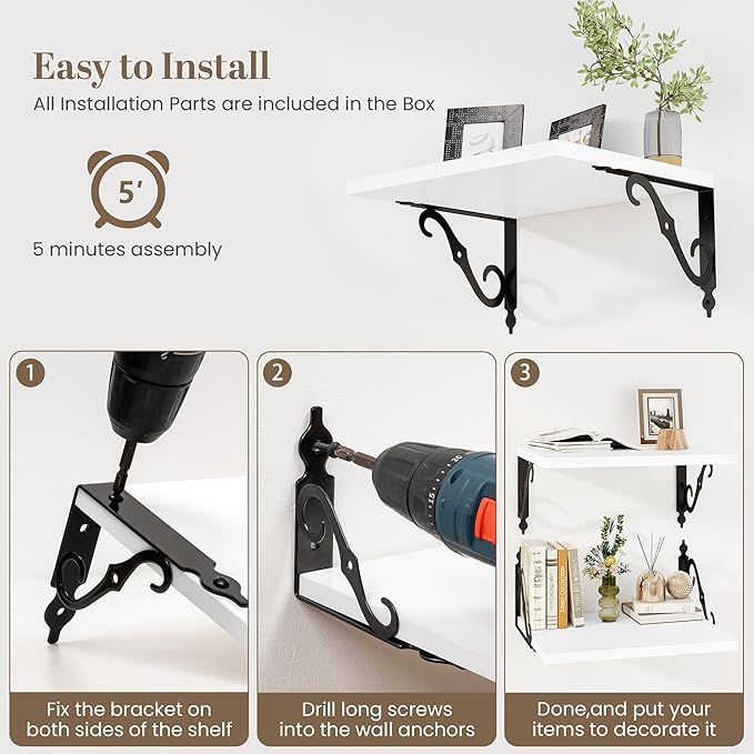 36 Inches Floating Shelves, Rustic Long Wall Shelves, 12 Inch Deep Book Shelf Wall Mounted with Bracket, Wide Display & Storage Shelves for Living Room, Bathroom, Bedroom, White, Set of 2