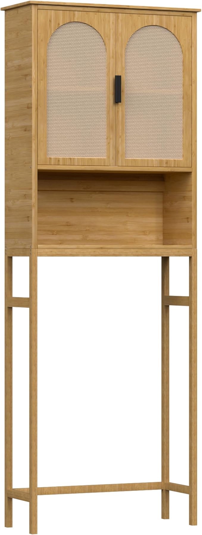 MUPATER 66.9'' Bamboo Over The Toilet Storage Cabinet, Bathroom Space Saver, U-Shaped Door with Rattan Surface, Over Toilet Bathroom Organizer with Open Storage Shelf, Natural