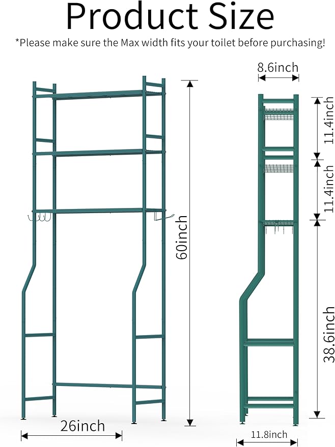 3 Tier Over The Toilet Storage Rack with 2 Basket, Metal Freestanding Bathroom Shelves Toilet with Paper Holder and 4 Hooks, Over Toilet Storage Shelf for Bathroom Storage, Green
