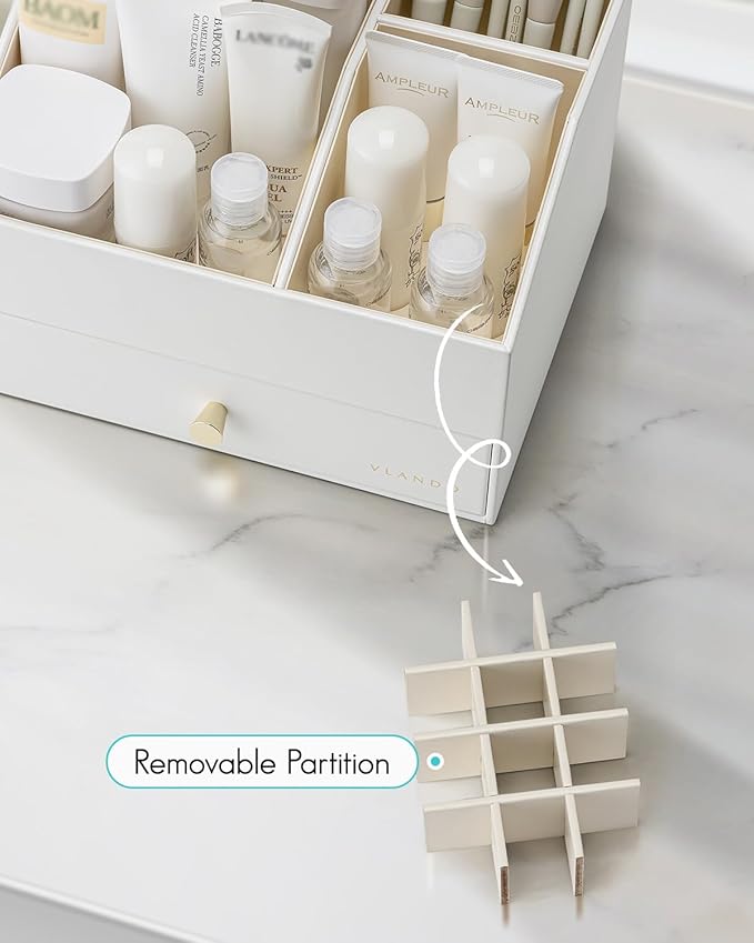 Vlando Makeup Organzier,Vanity Organizer with Drawers, PU Leather Skincare Organizer Perfume Organizer,Large Cosmetic Display Case for Lipstick,Brushes Gifts for Women-White