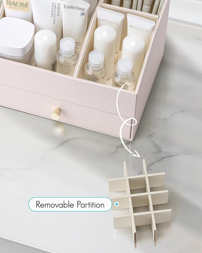 Vlando Makeup Organzier,Vanity Organizer with Drawers, PU Leather Skincare Organizer Perfume Organizer,Large Cosmetic Display Case for Lipstick,Brushes Gifts for Women-Apricot White