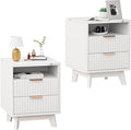 Fluted White Nightstand with 2 Drawers, 18" Modern Bed Night Stand with Faux Marble Top, Open Storage Shelf, Curved Edge Bedside Table for Bedroom, Living Room End Side Table