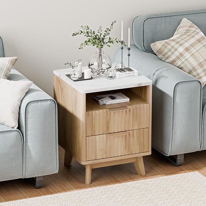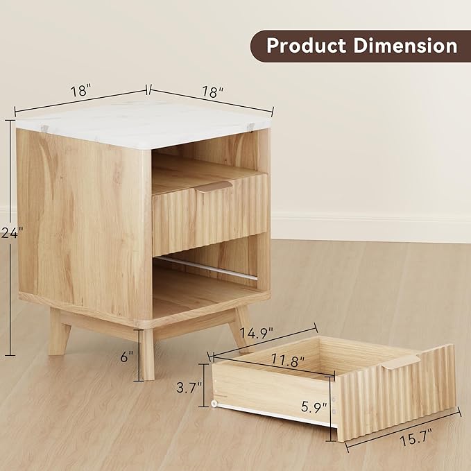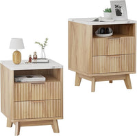 Fluted Nightstand Set of 2, 18" Modern Bed Night Stand with Faux Marble Top, 2 Drawers, Open Storage Shelf, Living Room End Table, Curved Edge Bedside Table for Bedroom, Natural Oak
