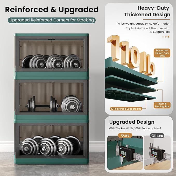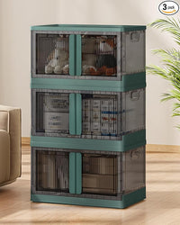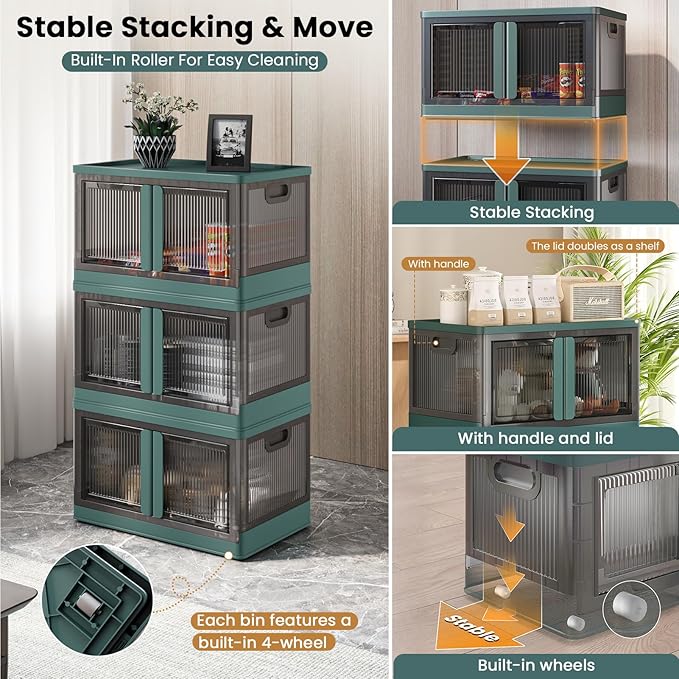 19Gal Collapsible Storage Bins with Lids & Wheels - 3 Pack Stackable with Doors, Heavy-Duty Plastic Containers for Home/Office, Green