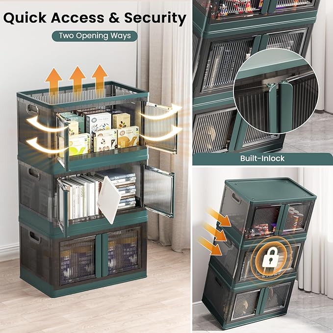 19Gal Collapsible Storage Bins with Lids & Wheels - 1 Pack Stackable with Doors, Heavy-Duty Plastic Containers for Home/Office, Green