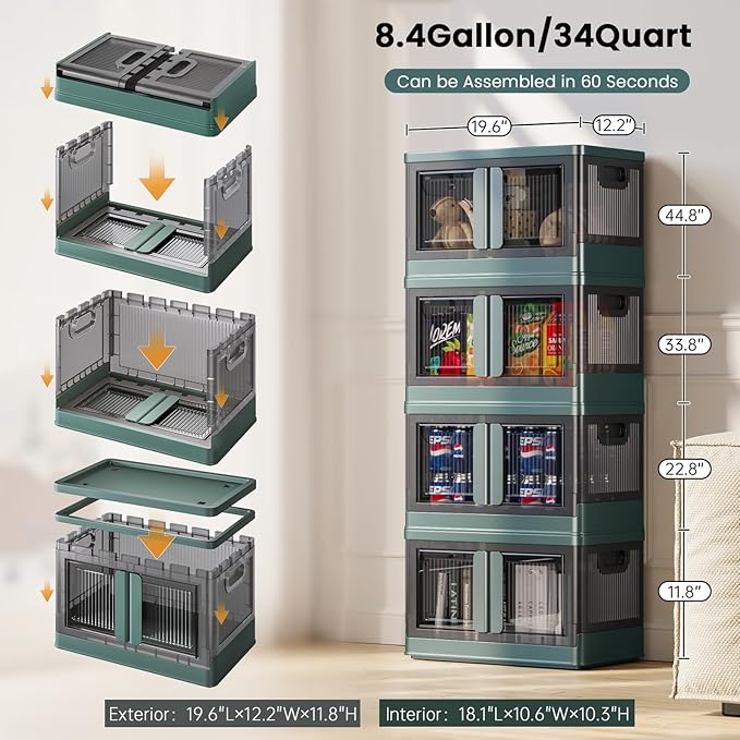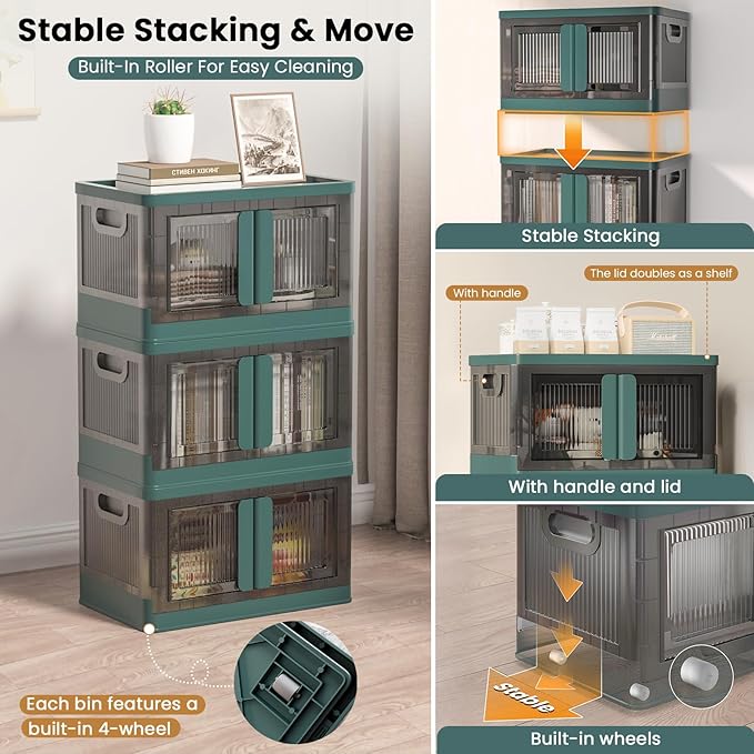 8.4Gal Collapsible Storage Bins with Lids & Wheels - 2 Pack Stackable with Doors, Heavy-Duty Plastic Containers for Home/Office, Green