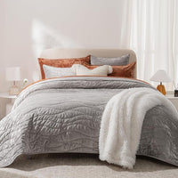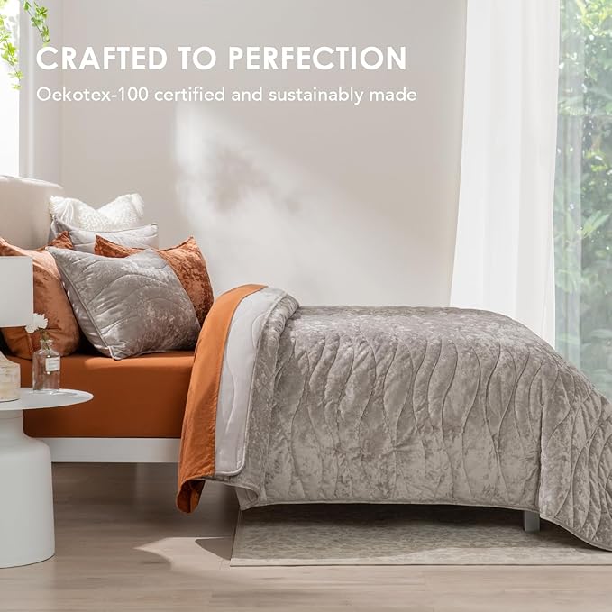 EVERGRACE Luxury Velvet Quilt King Size, Ultra Soft Wave Crushed Velvet Bedding Set, Lightweight Quilted Comforter Set for All Season, Oversized Bedspread Coverlet with 2 Shams, Silver Gray