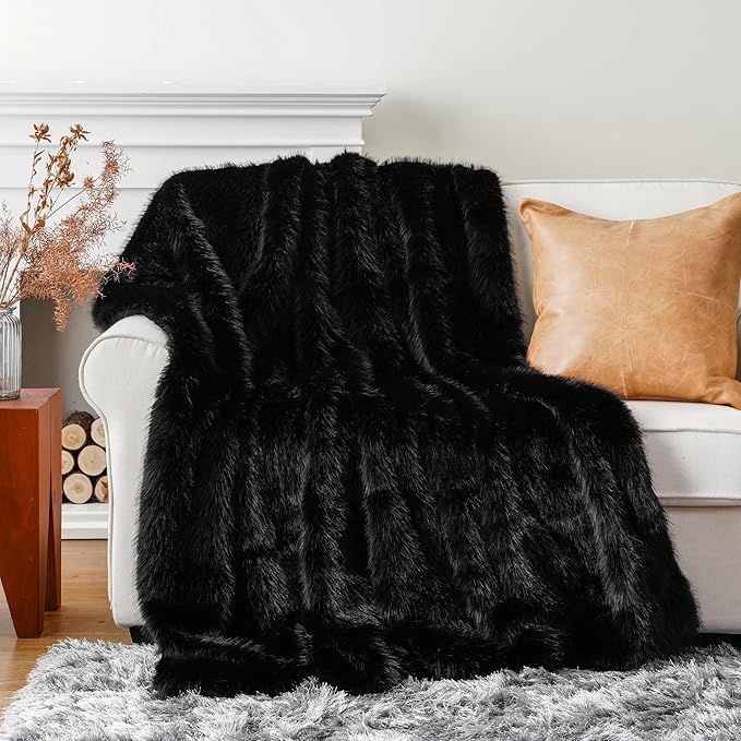 BATTILO HOME Luxury Black Faux Fur Throw Blanket, Large Cozy Warm Fluffy Fur Blanket for Bed,Couch, Sofa, Chair, Black Fur Throws with Long Pile, 60"x80"