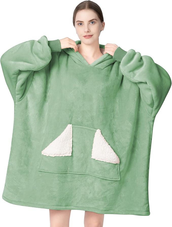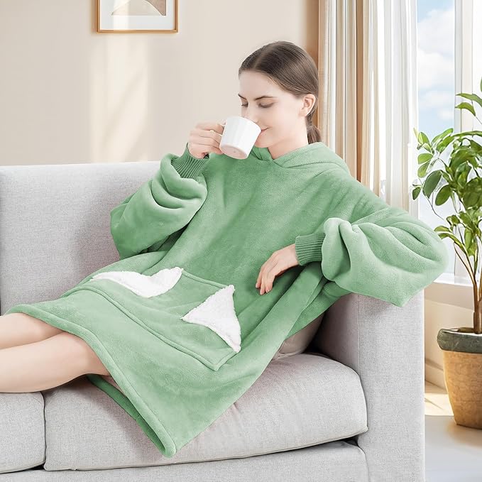 Touchat Wearable Blanket Hoodie, Oversized Sherpa Blanket Sweatshirt with Hood Pocket and Sleeves, Gifts Hooded Blanket for Adult Women Men (Light Green)