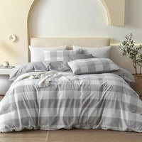 JIYUAN 100% Washed Cotton Duvet Cover Set 3 Pieces King, 1 Duvet Cover 104x90 Inches(Comforter Not Included) and 2 Pillowcases,Linen Feel Bedding Set Comfy and Breathable, Heathered Plaid Grey
