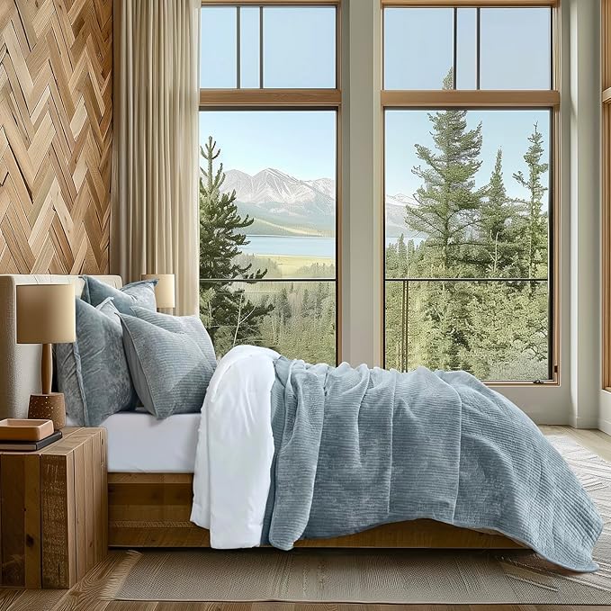 EVERGRACE Velvet Quilt Set Queen Size, Luxurious Soft Quilted Bedding Sets, Lightweight Velvet Comforter for All Season, Striped Channel Bedspread Coverlet with 2 Shams, Blue Linen