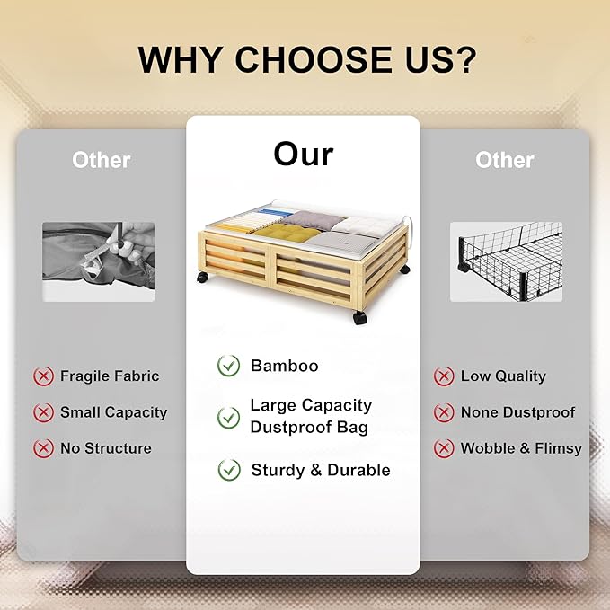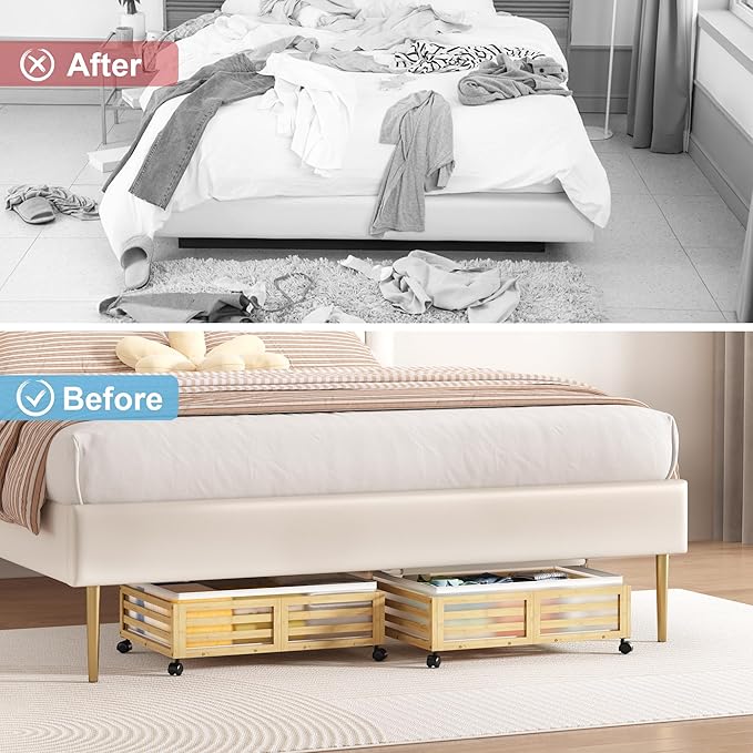 Under Bed Storage with Wheels-Large Bamboo Underbed storage Containers with Large Dust Bag Stackable Under the Bed Shoe Storage Bins for Clothes Books Bedding (2 Packs Nature, 23.62"L×16.54"W× 6.51"H)