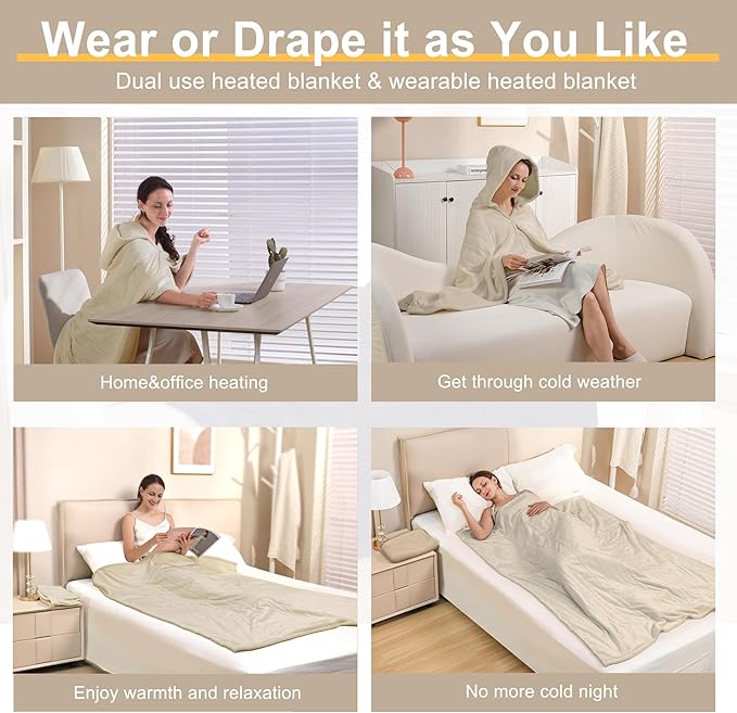 Gintao Heated Blanket Electric Throw with Detachable Hat&Snap Buttons,3 Heat Settings,4H Auto-Off, Perfect Electric Blanket Throw for Home Office,Gifts,Double-Layer Flannel, 50"x60", Beige