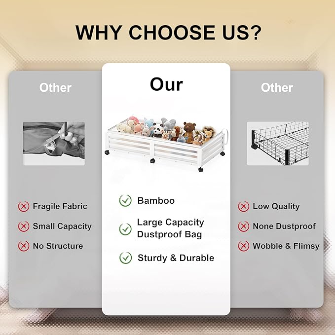 Under Bed Storage with Wheels-Large Bamboo Underbed storage Containers with Large Dust Bag Stackable Under the Bed Shoe Storage Bins for Clothes Books Bedding (2 Packs White, 33.07"L×16.54"W× 6.5"H)
