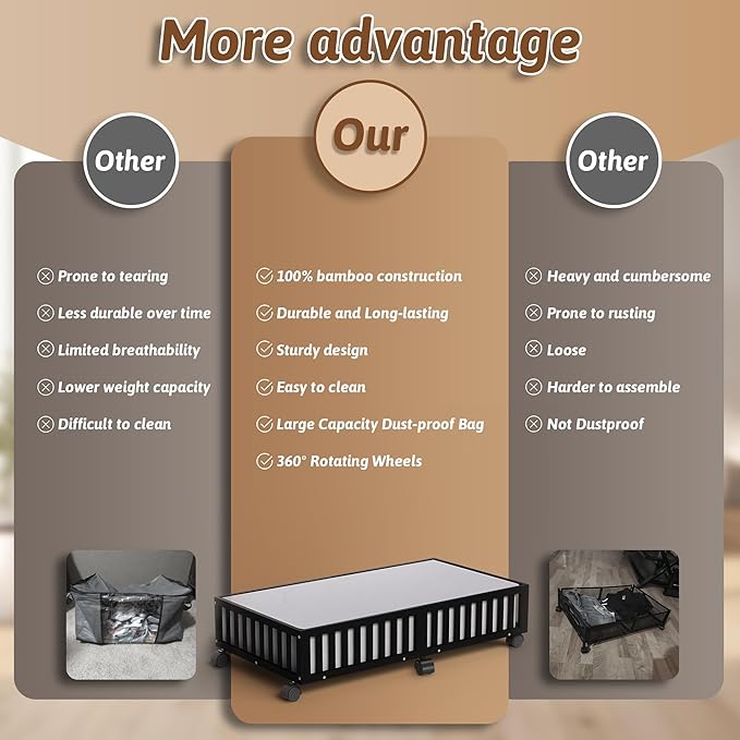 Bamboo Under Bed Storage Containers with Wheels, 1 Pack Large Under the Bed Shoe Storage Bins, Wood Rolling Underbed Drawers Organizer for Bedroom Closet Clothes Blanket Under Crib Toy Black