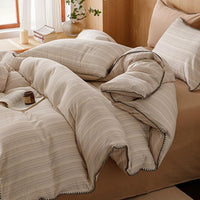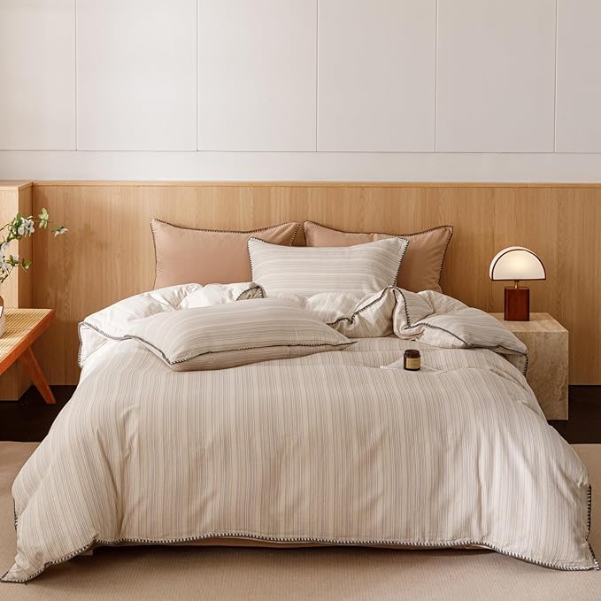 VM VOUGEMARKET 100% Linen Cotton Duvet Cover Set Queen 3pcs Yarn Dyed Vertical Pinstripe Ticking Pattern Breathable Farmhouse Bedding Set - Purple Yellow Stripe, Queen Size