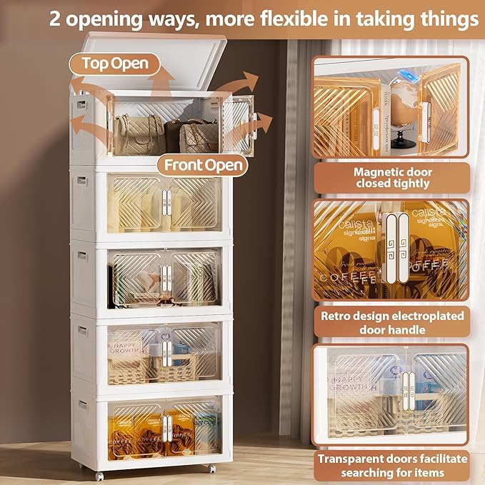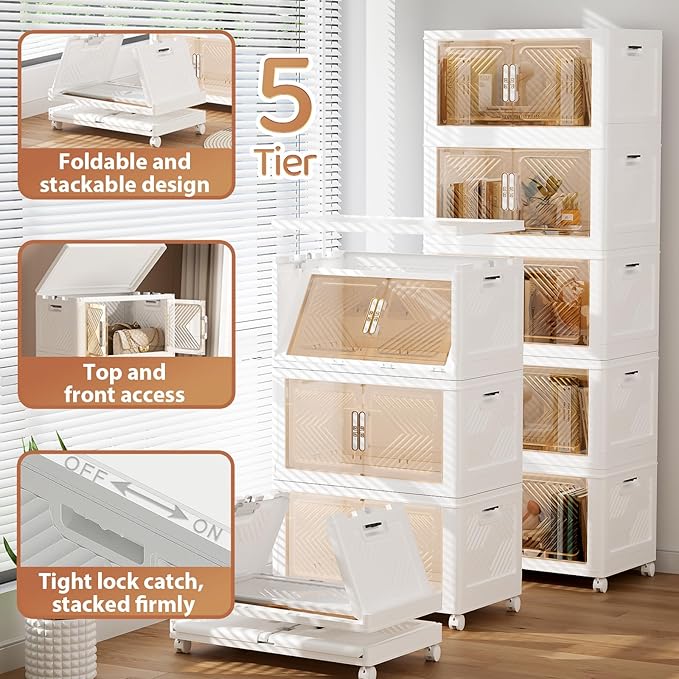 Storage Bins with Lid 76QT, Stackable Storage Containers with Wheels and Magnetic Doors, Plastic Clothes Closet Organizers and Storage Box for Pantry, Home and Office (5 Pack)