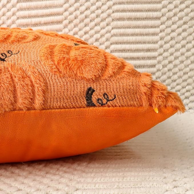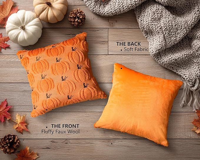 4TH Emotion Fall Pumpkin Decorative Pillow Covers 18x18 Set of 2, Orange Soft Plush Faux Fur Wool Farmhouse Throw Cushion Cases for Autumn Thanksgiving Holiday Home Decorations